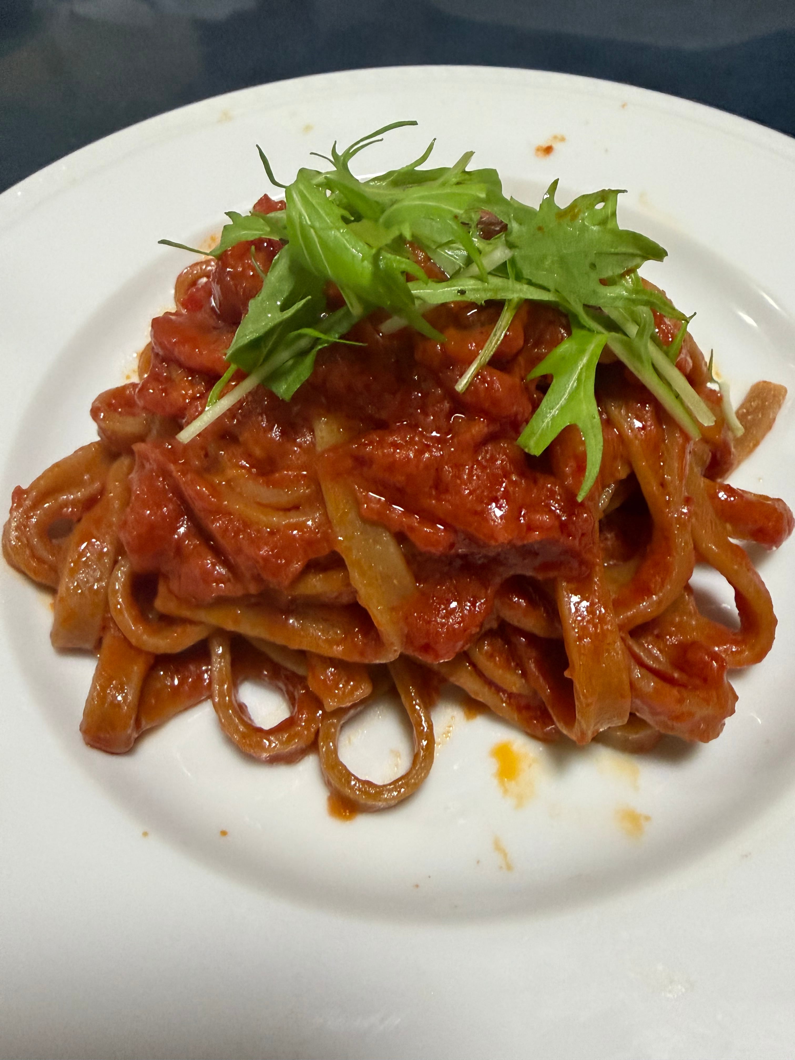 茹で上げた平麺にオリーブオイル、にんにく、トマトソースを絡めて。ソースが麺に絡みやすい平麺だから、味がしっかり乗ります。